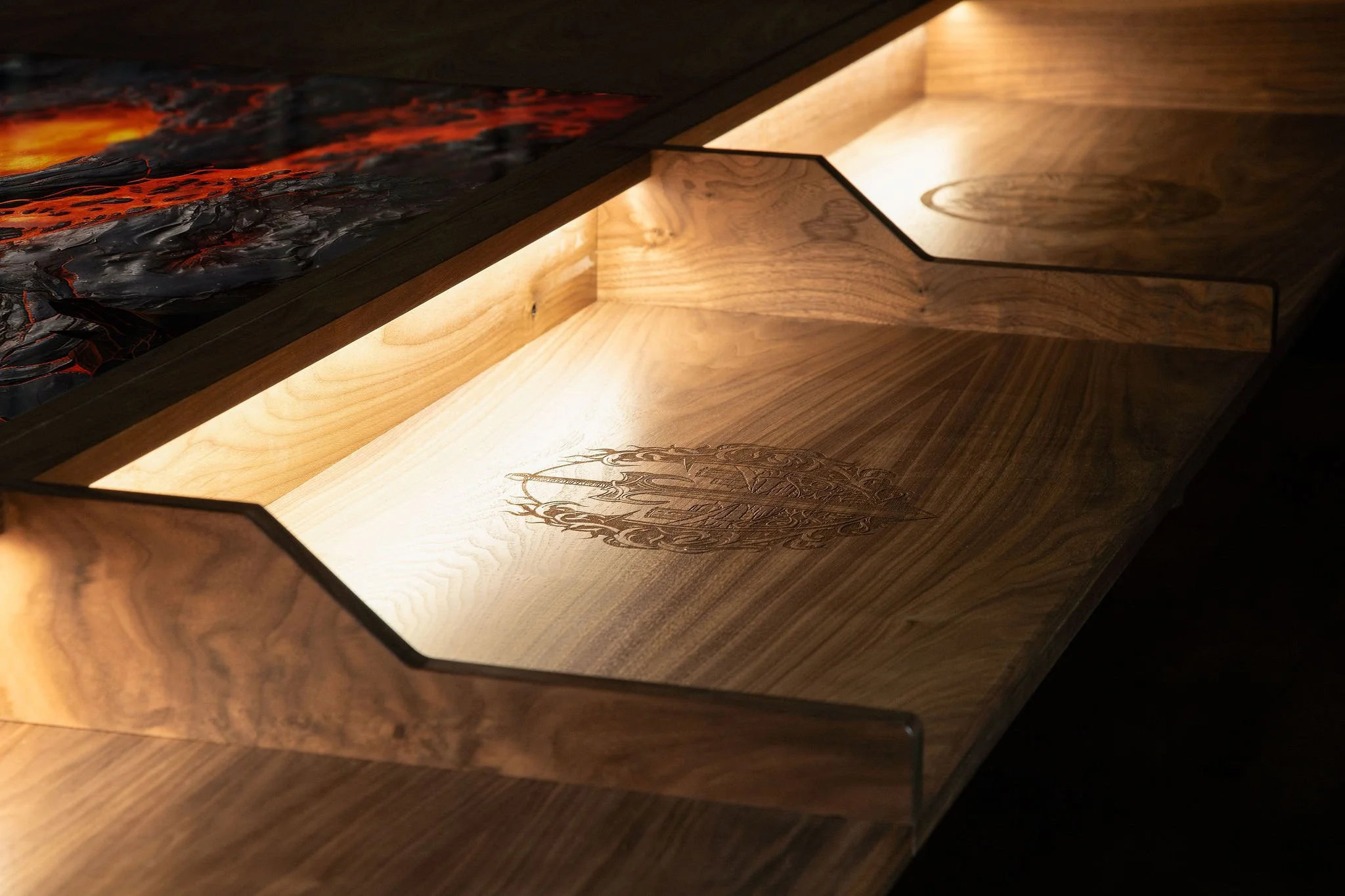 Custom engravings are a beautiful and personal way to make your game table truly one of a kind. Whether it’s a simple name or logo that’s engraved and filled with epoxy, a detailed crest, or a laser engraved scene featuring mythical creatures or your favorite game inspired designs, engraving adds a layer of personality and storytelling to your build.