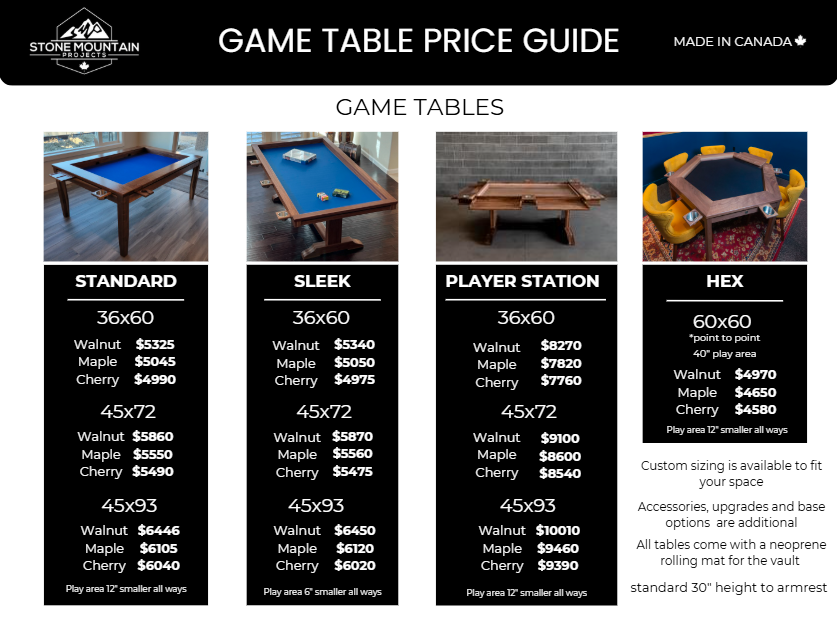A quick reference to help you explore styles, features, and pricing for your custom game table. Use this guide to plan your build and bring your vision to life. Once you’ve reviewed it, reach out and let’s start your game table journey together.